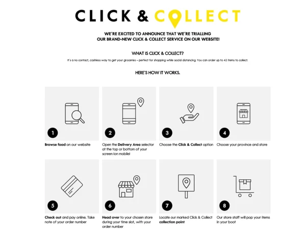 Secondly, in order to make shopping as safe as possible, they introduced a ‘Click & Collect’ module, which allowed customers to order items online and pick them up from a parking lot. This method allows customers to never leave their car or come into direct contact with staff. As of April 2020, Woolworths announced that they would be testing the solution at 14 locations across the country