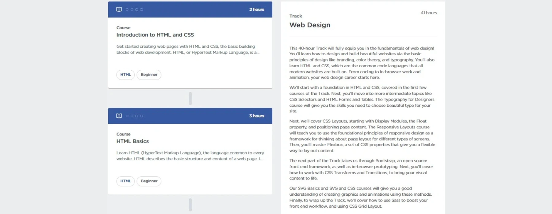 Treehouse’s Web Design Track combines interactive lessons in HTML, CSS, JavaScript, and emerging layout techniques like Flexbox and CSS Grid. With a project-driven approach, you’ll build a series of small websites that reinforce each new skill. The curriculum also delves into best practices in responsive design and user experience.