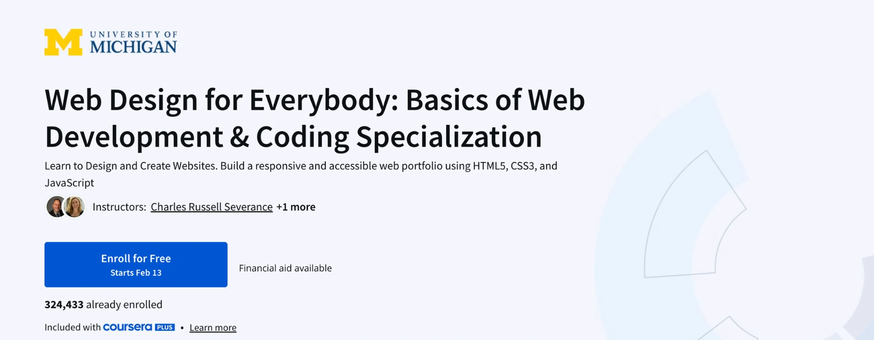 This University of Michigan specialization introduces HTML, CSS, and JavaScript, along with design fundamentals like layout, typography, and color theory. Projects guide you through building functional, responsive sites from scratch. The course’s progressive structure suits those with minimal background in coding or design.