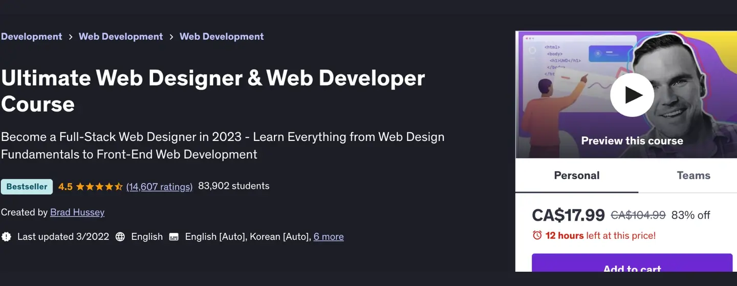 - Best For: Absolute beginners seeking an in-depth course on both creative and technical aspects of web design.