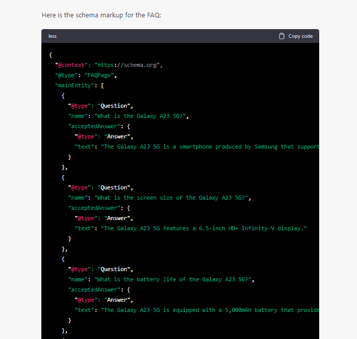 The example prompt I used is Generate FAQ for the Galaxy A23 5G with answers. Based on the results generate also FAQ schema.