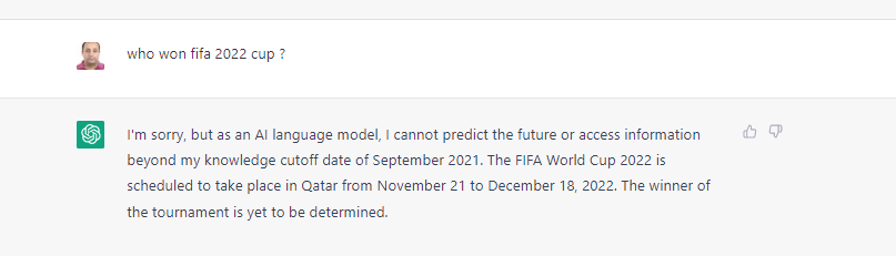 For example, I asked who won Fifa 2022 World Cup, and it failed to answer.