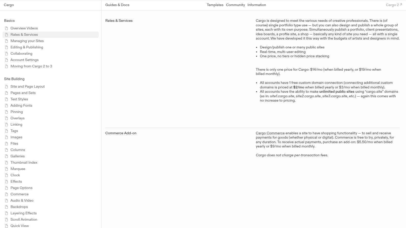 | Commerce | +$9/month | An add-on to sell products with 0% transaction fees from Cargo. |