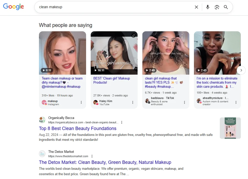 If you perform a search for the query “clean makeup,” you will see all of the usual SERP links and features you’d expect — people also ask, shopping, Reddit links, and more — but also a section titled “What people are saying.”  It’s a featured section with a carousel of social posts from, in this case, Instagram, YouTube, and TikTok. The example below has been excerpted from the middle of a Google incognito SERP to illustrate the point.