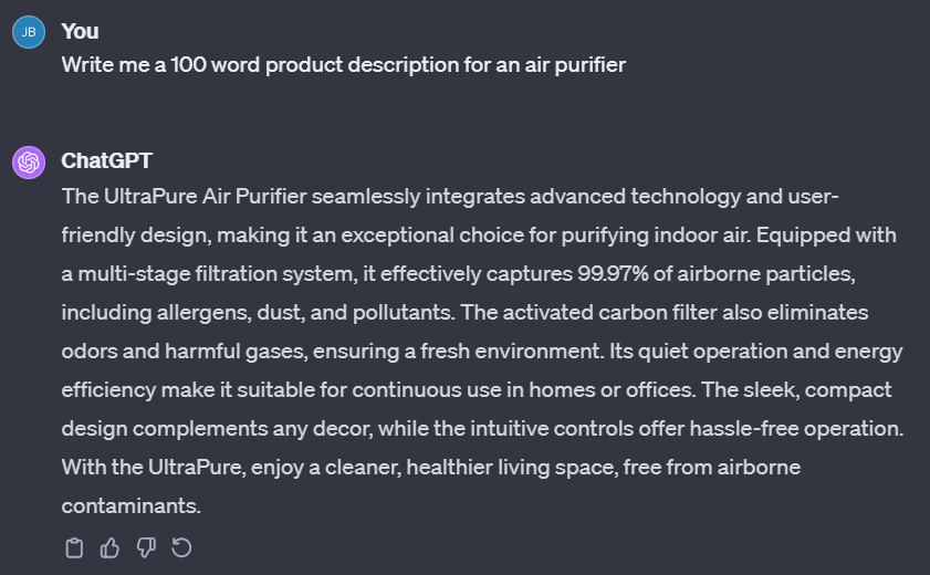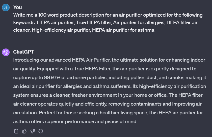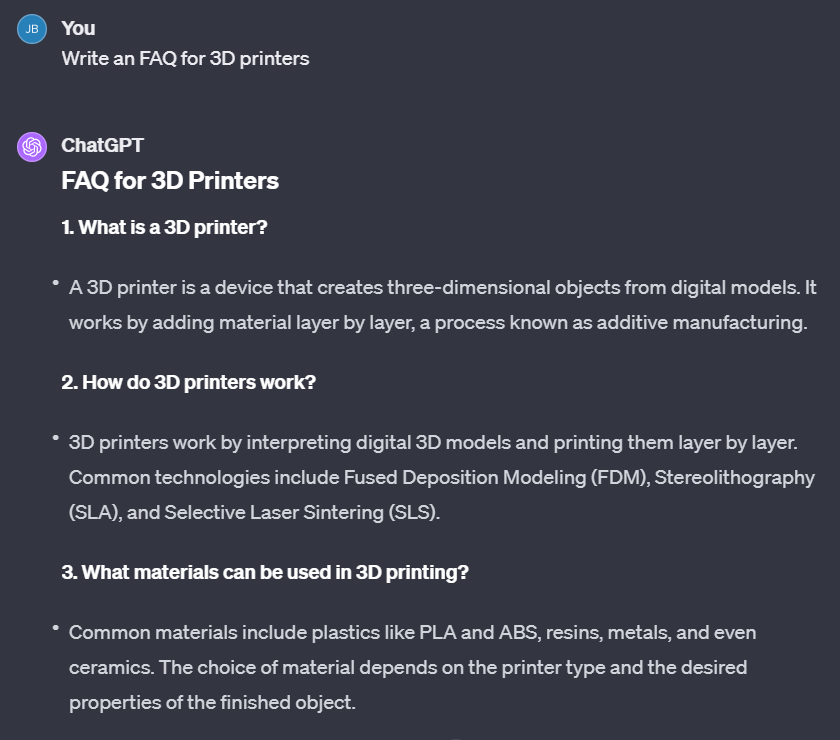 Be Specific and Clear: AI works best with precise instructions. Instead of saying “Write an FAQ for 3D printers,” say “Write 2 FAQs with 50-word answers about desktop 3D printer functionality that a customer might ask before purchasing.” The specificity of this prompt helps ensure a response that is commercial in its intent rather than informational.