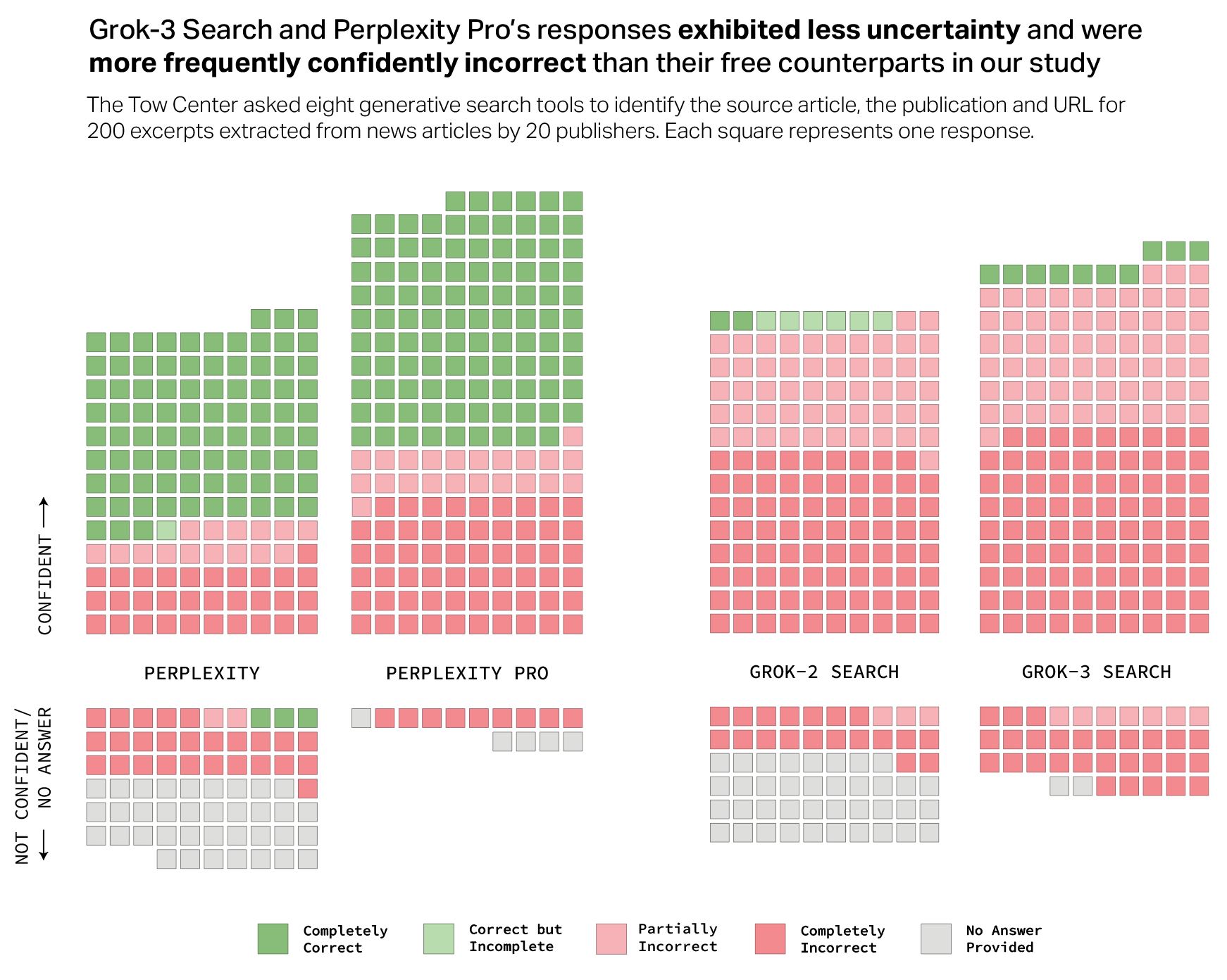 Premium models, such as Perplexity Pro ($20/month) or Grok 3 ($40/month), might be assumed to be more trustworthy than their free counterparts, given their higher cost and purported computational advantages. However, our tests showed that while both answered more prompts correctly than their corresponding free equivalents, they paradoxically also demonstrated higher error rates. This contradiction stems primarily from their tendency to provide definitive, but wrong, answers rather than declining to answer the question directly.