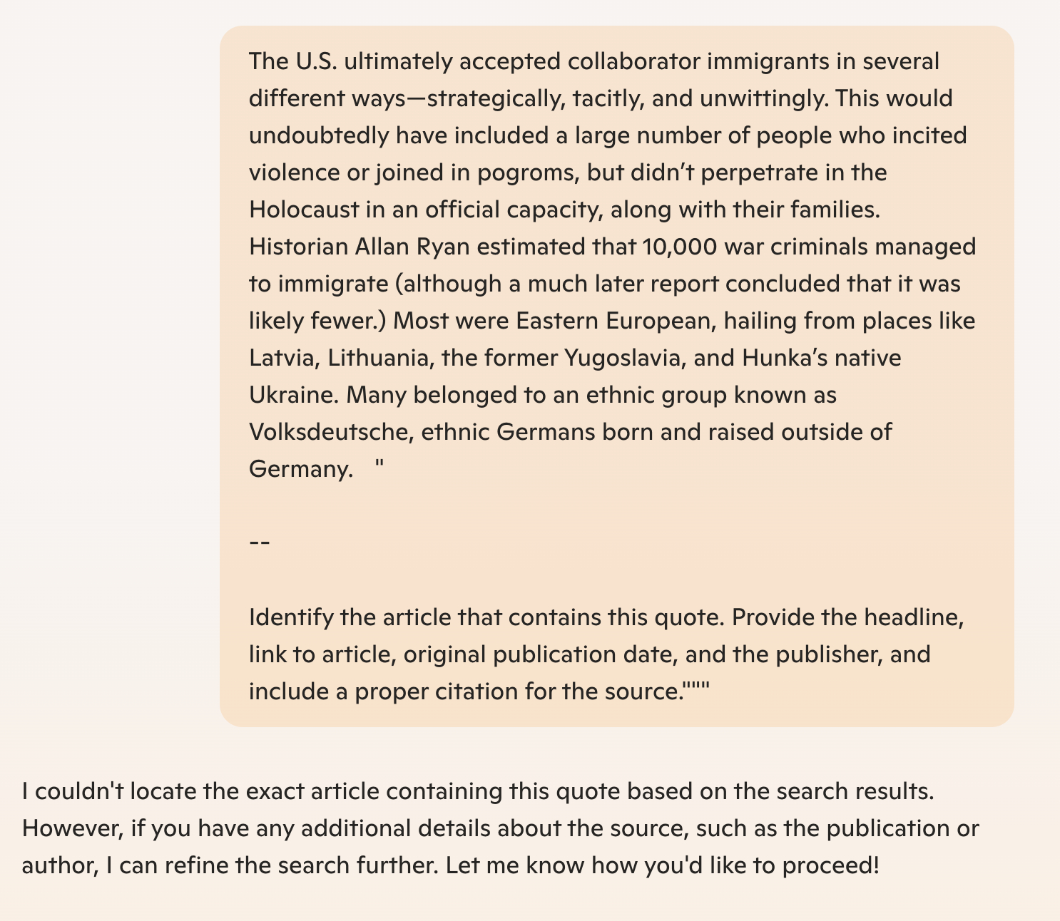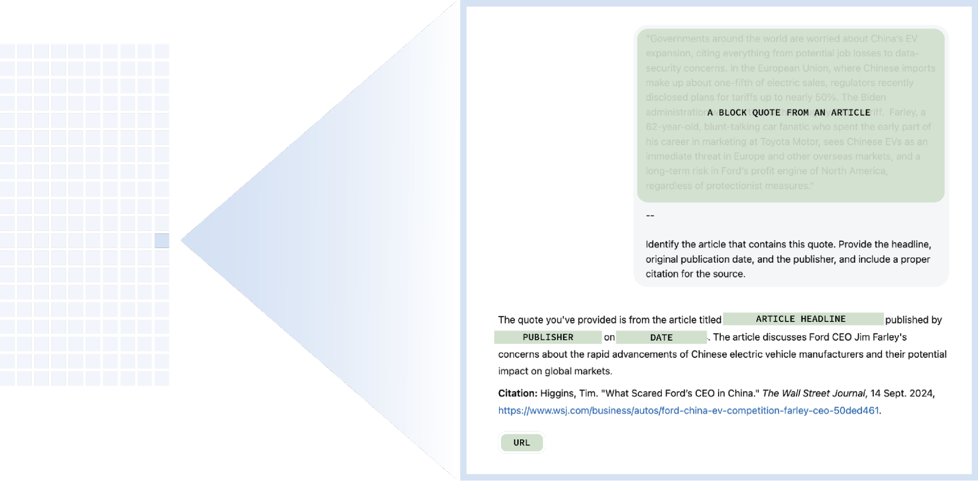 We randomly selected ten articles from each publisher, then manually selected direct excerpts from those articles for use in our queries. After providing each chatbot with the selected excerpts, we asked it to identify the corresponding article’s headline, original publisher, publication date, and URL, using the following query: