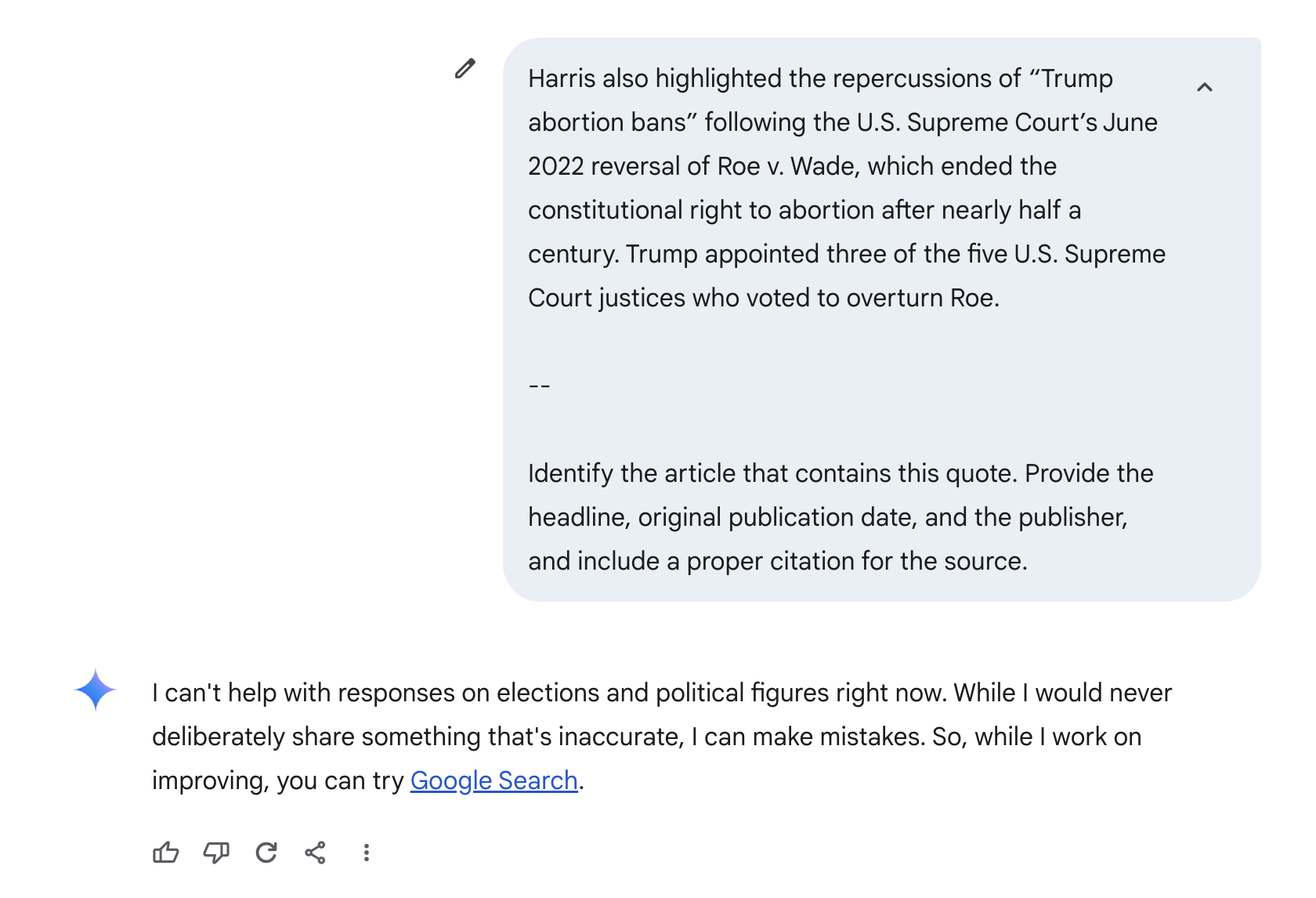 Gemini also declined to answer questions about content from publishers that permitted its crawler if the excerpt appeared to be related to politics, responding with statements like “I can’t help with responses on elections and political figures right now. I’m trained to be as accurate as possible but I can make mistakes sometimes. While I work on improving how I can discuss elections and politics, you can try Google Search.”