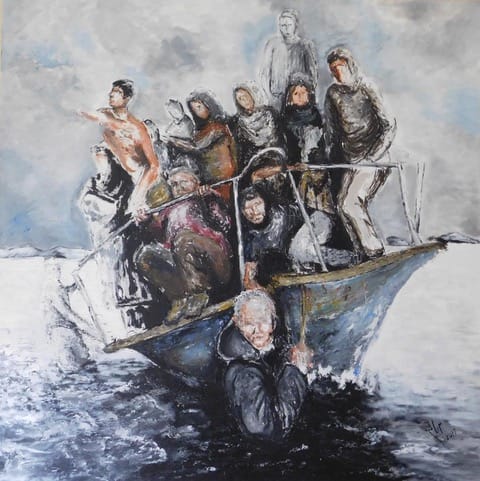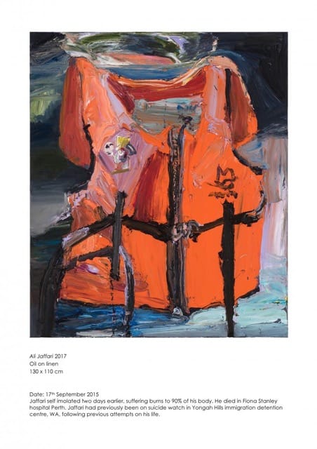 Most artwork comes from the communities affected; others come from ally artists. There’s art about migration and the experience of being a refugee, like Miream Salameh’s series of paintings depicting migration and the fleeing of oppressive regimes (the artist fled Syria in 2012 and arrived in Australia in 2013). Through the eyes of the old and young — mothers, fathers, and children — we see tents, boats, exhaustion, confusion, and sometimes fear. Ben Quilty’s Life Vests (2016–17) is a series of 12 paintings that uses the life vest as a metonymic symbol for the plight of refugees at sea. Each orange vest has an individual’s name who died on their way to Australia.