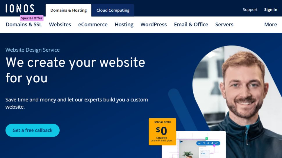 From one of the biggest web hosting companies in the world, Ionos, comes MyWebsite Design Service which clearly targets novices with a bit more ambition than just a one-pager. This web design service has three tiers with a setup fee ($199-$399 depending on the plan, though we’ve seen this dropped in occasional sales) that takes care of building the actual website and throws in a free domain name. You can have up to seven custom pages – built after a design consultation period – but no option to buy more.