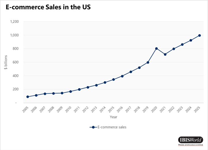 With e-commerce being the main outlet of discretionary consumer spending, the e-commerce industry has experienced a surge in demand. IBISWorld anticipates e-commerce sales will spike 34.2% in 2020 alone as consumers turn to online retailers since nonessential brick-and-mortar locations remain temporarily closed in order to prevent the spread of the COVID-19 pandemic. Still, essentials are becoming more available online as industry operators try to cater to the surge in demand and provide medical supplies, household staples, among other high priority items.