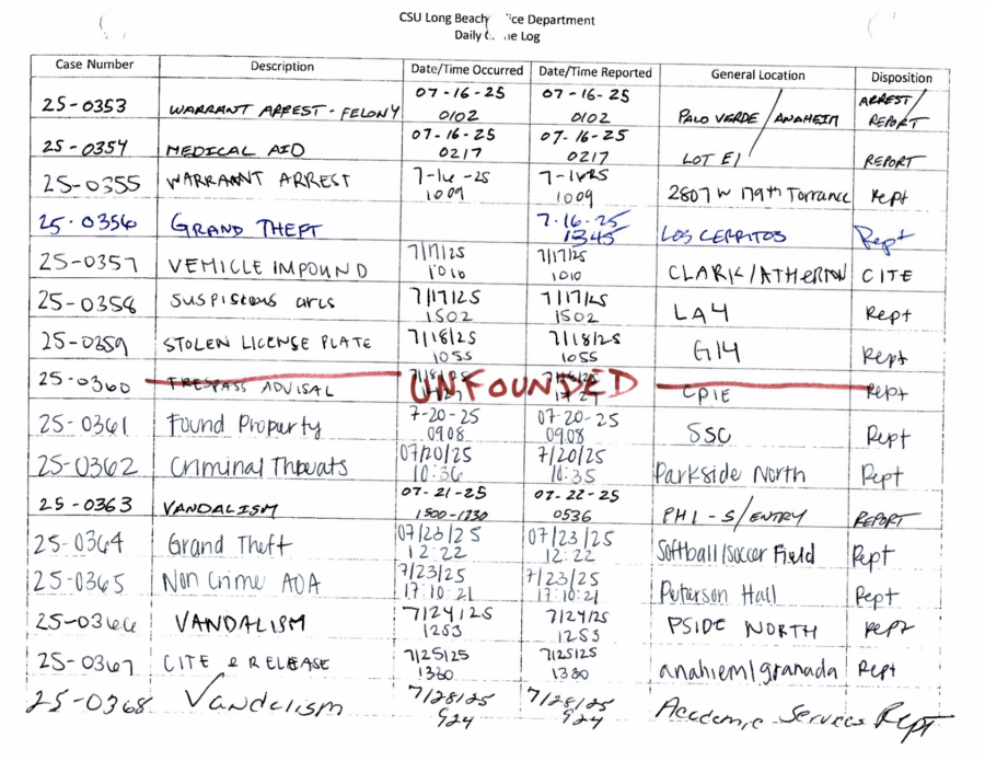 Scan of daily crime logs filled out by university police. Monica Garcia | Long Beach Current
