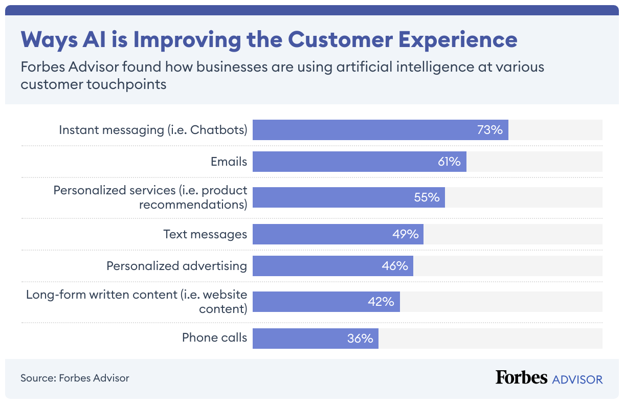 AI is playing a significant role in enhancing customer experiences across touchpoints. According to the Forbes Advisor survey, 73% of businesses use or plan to use AI-powered chatbots for instant messaging. Moreover, 61% of companies use AI to optimize emails, while 55% deploy AI for personalized services, such as product recommendations.