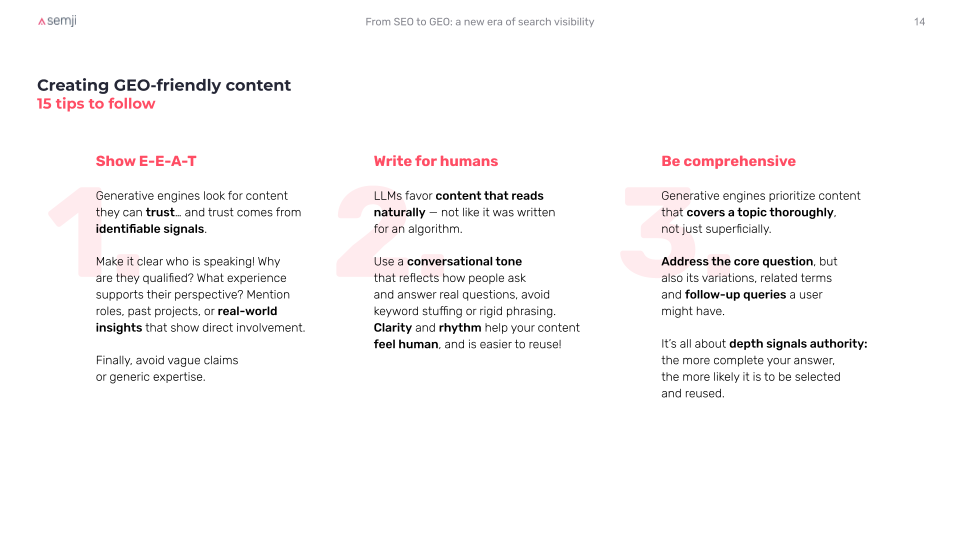 In the GEO guide we’re sharing with you in this article, 15 tips are delivered–here are 3 of the most important ones: