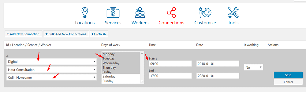 The Connections tab is where you actually link up your locations, services, and workers. For example, you can specify that: