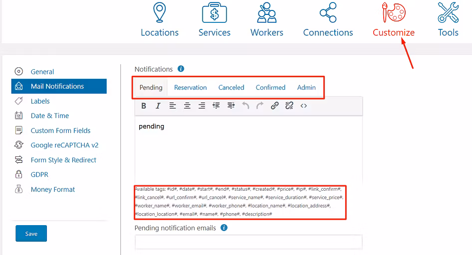 You can specify emails for Pending, Reservation Info, Canceled,Confirmed and Admin. Set each email text in its corresponding tab. And make sure to utilize the tags at the top of the email editor box. They allow you to insert dynamic content into your emails.