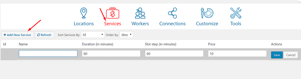 On the Services tab, you can click + Add New Service to spell out which different services people can book as well as how long those services last for.