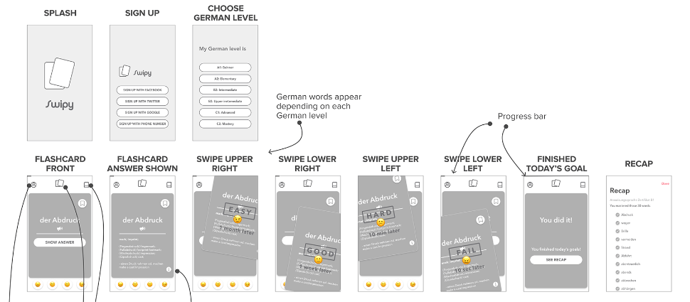 For example, Risa Nakajima is a Berlin-based app designer who used a three-stage wireframing process in the mobile app design process for Swipy, a German language learning and vocabulary app. Stage one commenced with paper wireframing followed by mid-fidelity wireframing via Adobe XD, using grayscale to focus on checking functionality. Risa completed the wireframing process with a UI design phase via high-fidelity wireframing.