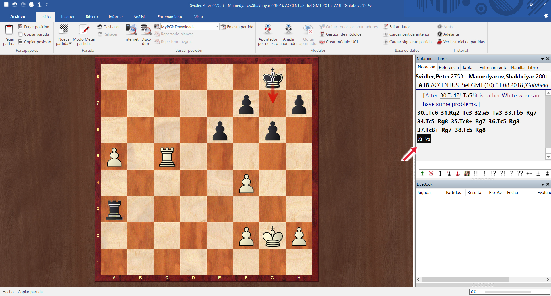 Click with the mouse on the result of the game and then press “Ctrl + C” (to copy the notation to the clipboard)