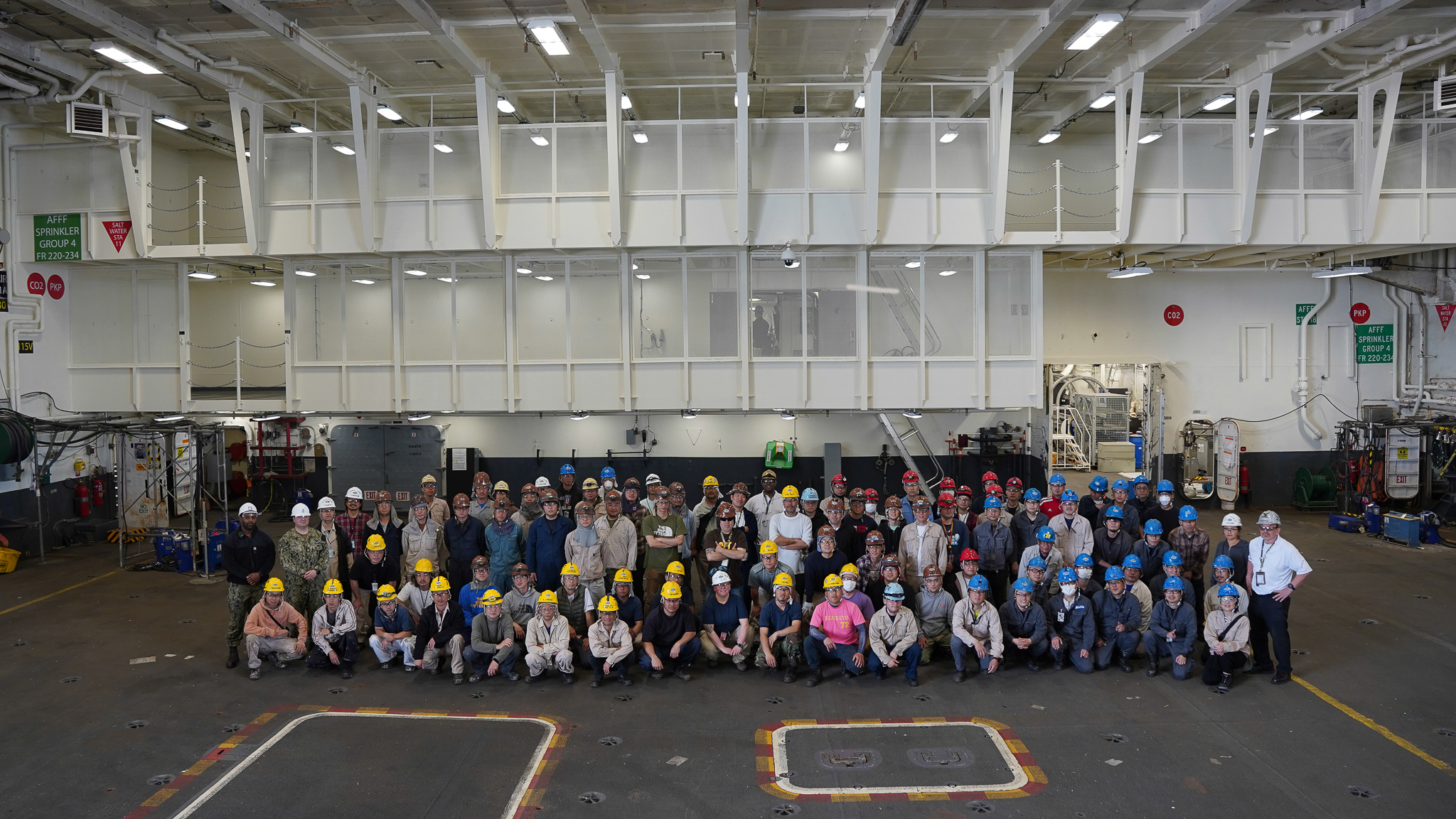 YOKOSUKA, Japan (Apr. 21, 2025) – U.S. Naval Ship Repair Facility and Japan Regional Maintenance Center (SRF-JRMC) installed the dual-level hanger mezzanine onboard the USS George Washington (CVN 73).