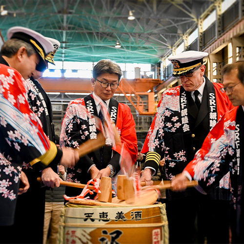 Yokosuka, Japan – U.S. Naval Ship Repair Facility and Japan Regional Maintenance Center (SRF-JRMC) held its annual New Year Ceremony on board Commander Fleet Activities Yokosuka (CFAY) on January 17 with a “Kagami Biraki,” a traditional Japanese ceremony that brings friends and colleges together to break open a sake barrel to usher in good fortune, prosperity, and unity for the coming year.