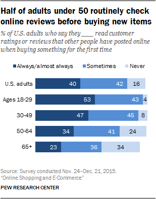 The survey also illustrates the extent to which Americans are turning toward the collective wisdom of online reviews and ratings when making purchasing decisions. Roughly eight-in-ten Americans (82%) say they consult online ratings and reviews when buying something for the first time. In fact, 40% of Americans (and roughly half of those under the age of 50) indicate that they nearly always turn to online reviews when buying something new. Moreover, nearly half of Americans feel that customer reviews help “a lot” to make consumers feel confident about their purchases (46%) and to make companies be accountable to their customers (45%).