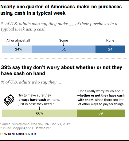 Finally, this survey documents a pronounced shift in how Americans engage with one of the oldest elements of the modern economy: physical currency. Today nearly one-quarter (24%) of Americans indicate that none of the purchases they make in a typical week involve cash. And an even larger share – 39% – indicates that they don’t really worry about having cash on hand, since there are so many other ways of paying for things these days. Nonwhites, low-income Americans and those 50 and older are especially likely to rely on cash as a payment method.