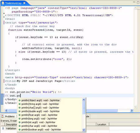 WTP supports JSP-based Web application development including the use of static HTML pages, JavaScript, CSS, JSP EL, and servlets. The JSP source editor extends the HTML editor’s capabilities, providing content coloring and code assist inside Java, JSP, Tag Library, EL, and JavaScript code fragments. WTP also supports JSR 45-compliant debugging, enabling breakpoints to be set in JSP source, stepped through, and so on. JSPs are created in the WebContent folder, located in the Project Explorer tree structure of any Web Project type.