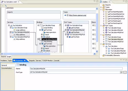 The WSDL editor provides a graphical editing view in addition to a source view, and can be used to define and modify imported schemas, types, messages, port types, bindings, and services. To create a WSDL file, select New from the Project Explorer, then select Web Services, and finally select WSDL. Supply the parent folder, if necessary, and the file. The remaining options are helpful in creating a WSDL you intend to hand-edit.