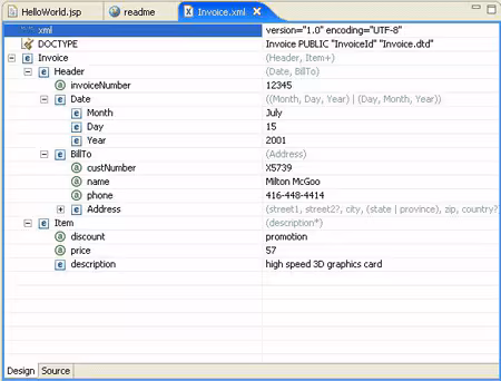 In addition to the source view, there’s also a design view for XML. The design view is somewhat like a combination of the outline view and the property view in that it offers a structural image of the XML file, complete with attribute settings. However, unlike the property and outline views, in the design view all the content is visible and editable.