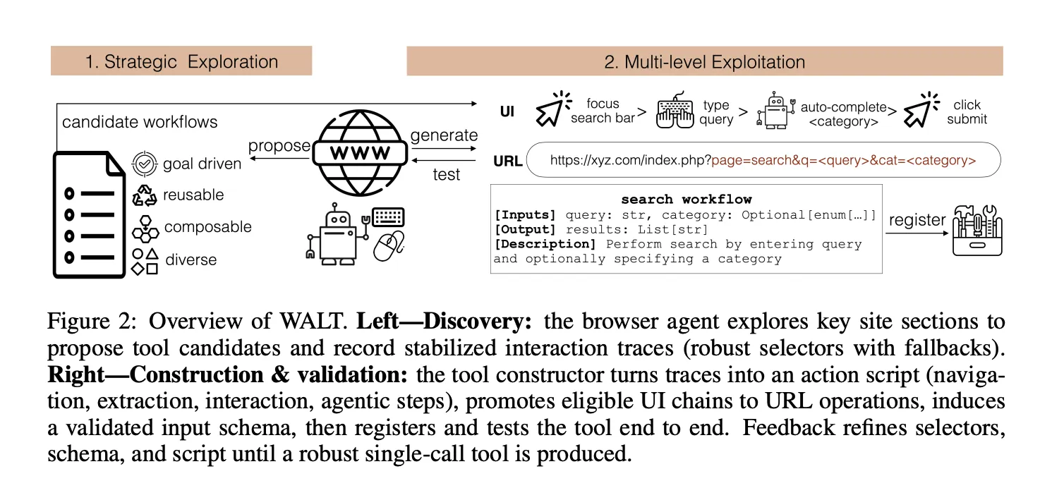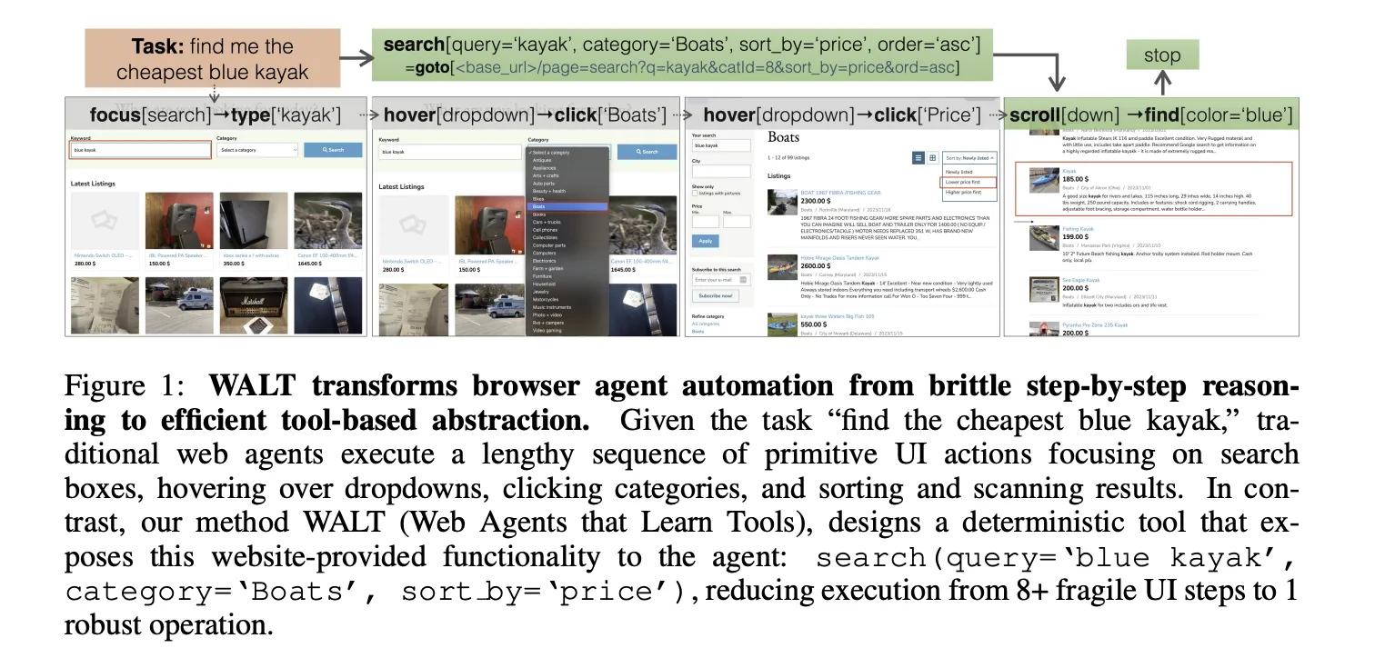 A team of Salesforce AI researchers introduced WALT (Web Agents that Learn Tools), a framework that reverse-engineers latent website functionality into reusable invocable tools. It reframes browser automation around callable tools rather than long chains of clicks. Agents then call operations such as search, filter, sort, post_comment, and create_listing. This reduces dependence on large language model step by step reasoning and increases determinism during execution.