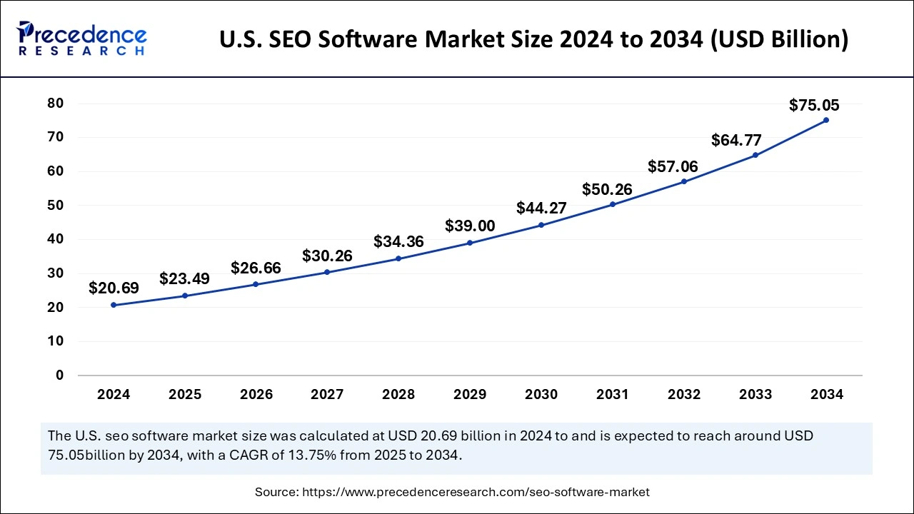 According to Precedence Research, the U.S. SEO software market size is calculated at USD 23.69 billion in 2025, grew to USD 26.66 billion in 2026 and is anticipated to reach around USD 75.05 billion by 2034, growing at a CAGR of 13.75% from 2025 to 2034.