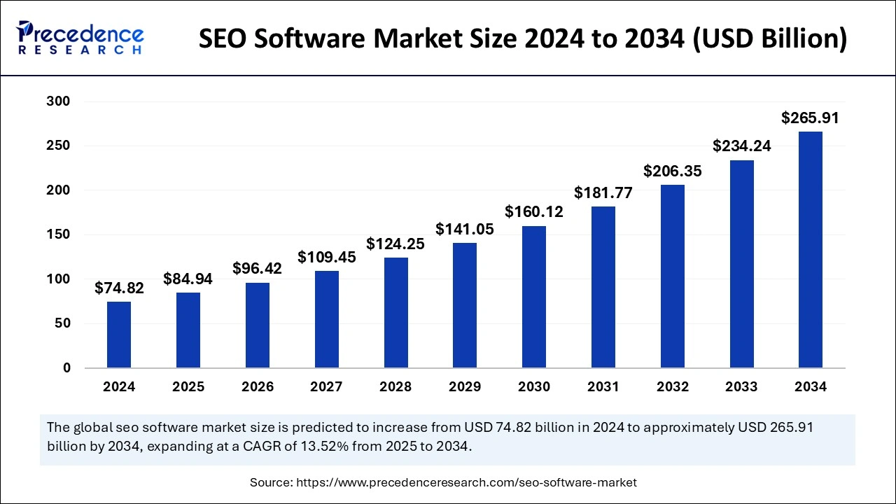 Ottawa, April 30, 2025 (GLOBE NEWSWIRE) — The global SEO software market size was valued at USD 74.82 billion in 2024 and is estimated to rise from USD 84.94 billion in 2025 to USD 265.91 billion by 2034. The North American SEO software industry was calculated at USD 26.19 billion in 2024 and is projected to grow at a compound annual growth rate (CAGR) of 13.67% over the forecast period.
