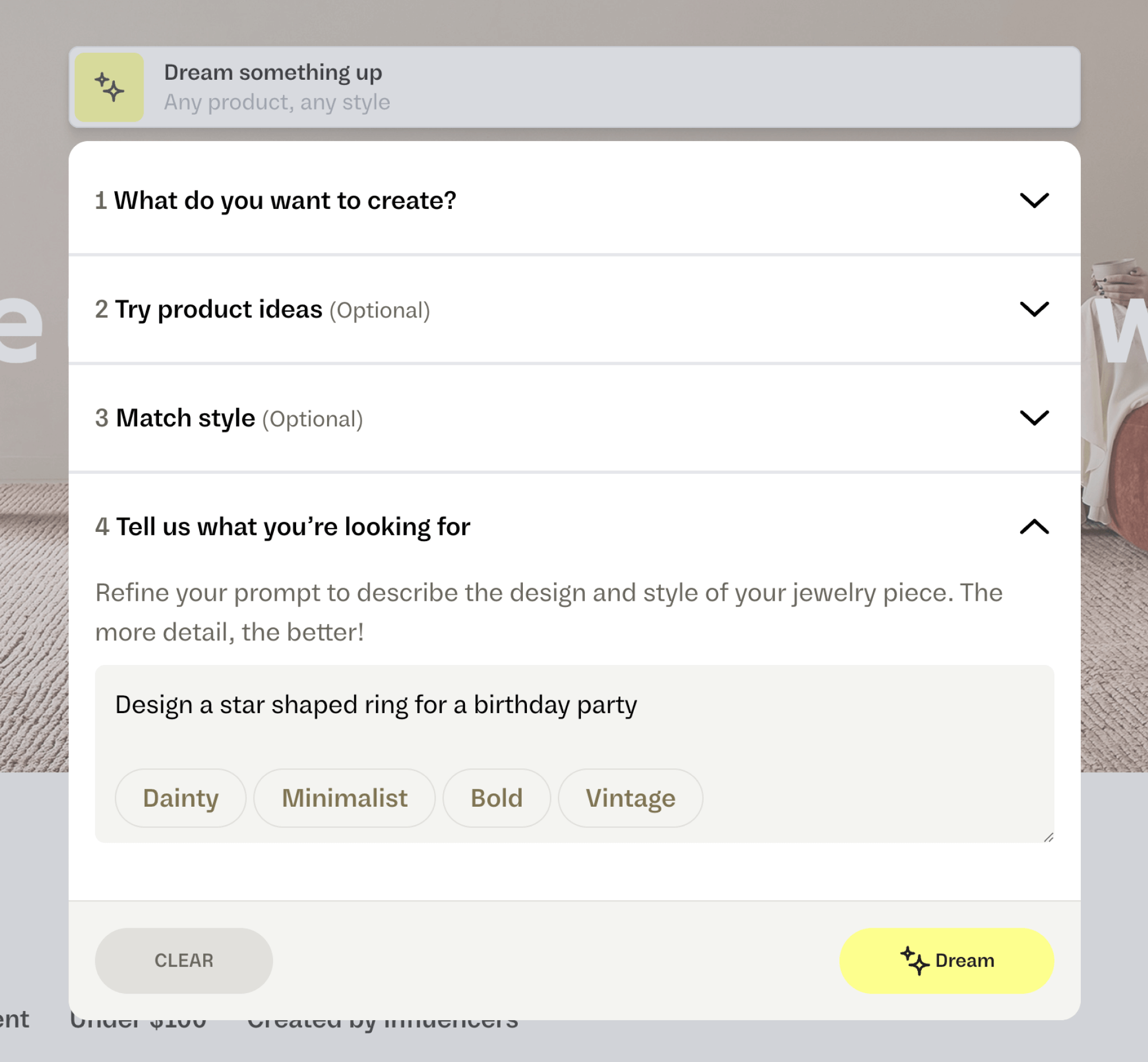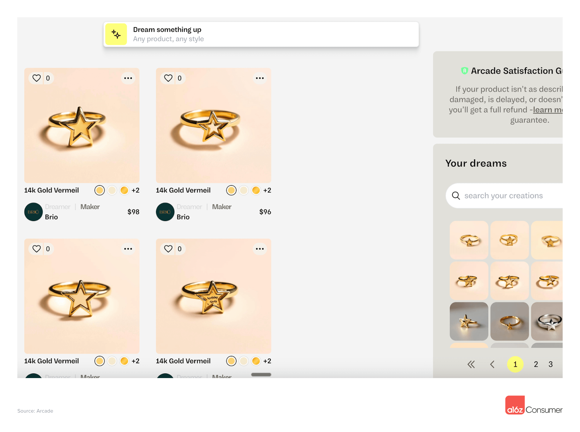 Platforms like Arcade AI offer an early glimpse of what’s coming. A prompt as specific as: “Design a star-shaped ring for a birthday party” doesn’t return static product listings, it generates unique designs, based on your input. Users can refine the details and the AI updates both the product and the price in near real time.