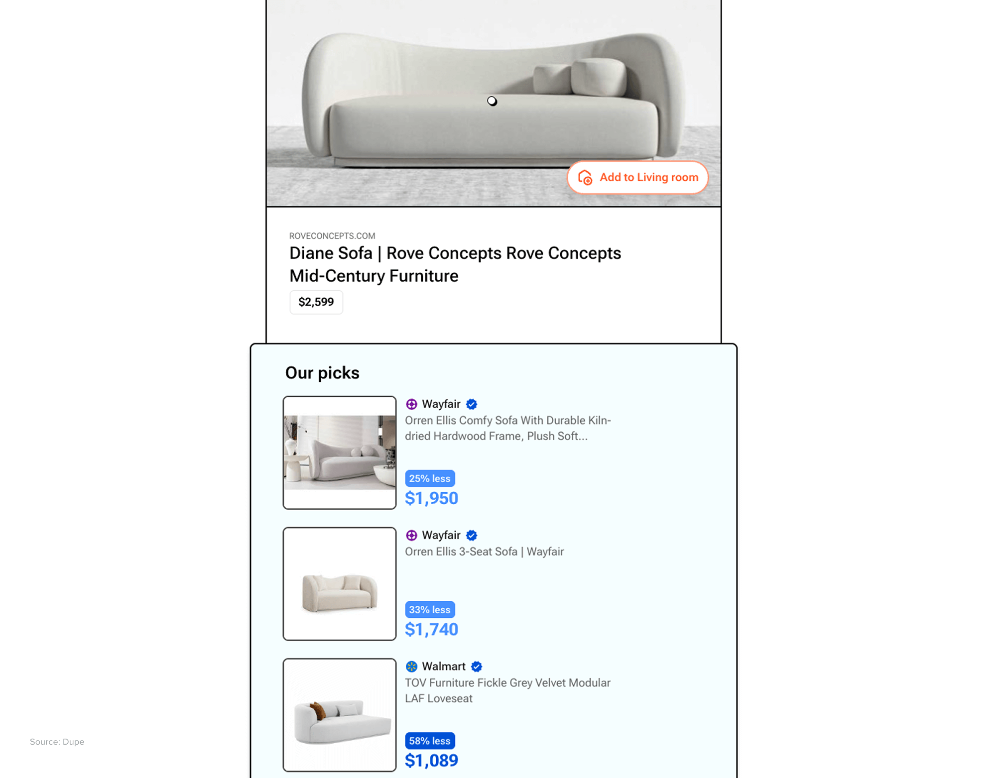 Discovery and search have long been the front door for online shopping. Now, startups are using that same wedge to build personalized shopping assistants designed to surface the right product at the right price. Many are building on multimodal models that engage users through text, images, and visual input. They’re also targeting a wide range of consumer priorities to gain market share. Dupe, for example, helps users find affordable alternatives to big-ticket furniture items, while Beni surfaces secondhand options for environmentally conscious shoppers. The strategy is clear: hook users where they start with smarter, more personalized discovery.