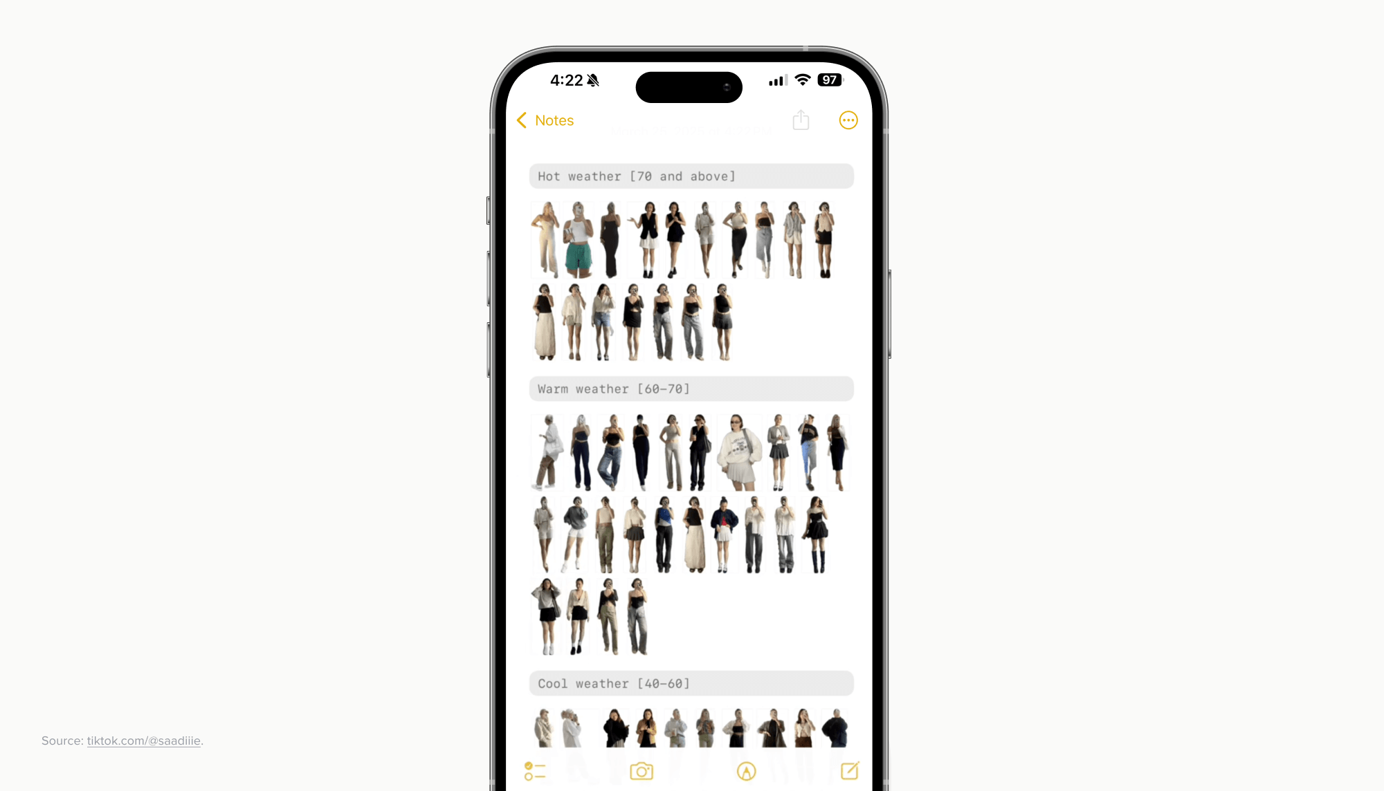 Today, TikTok is filled with people trying to solve the same issue. Some even resort to categorizing outfits in their Notes app to stay organized.