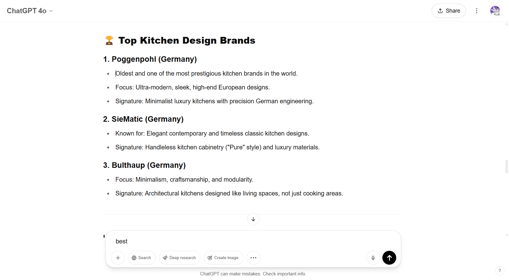 - Claudia started out by going to ChatGPT and typing in “best kitchen design brands,” and found some information mentioning several designer brands.