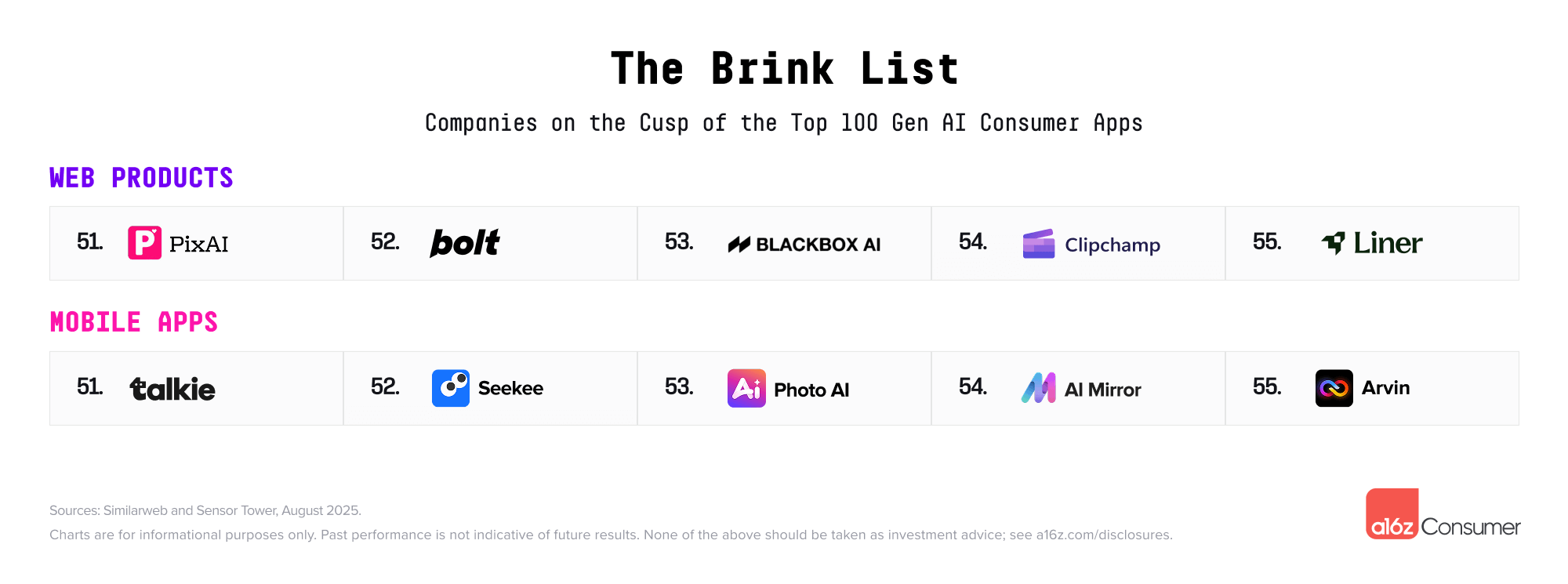 For the second time, we’re also publishing the “Brink List”: the next 10 companies (five on web, five on mobile) that just missed the cut-off. From last edition’s web Brink List, one company moved into the top 100—Lovable, jumping to an impressive #22 in the rankings! This jump highlights the broader rise of AI-powered app generation