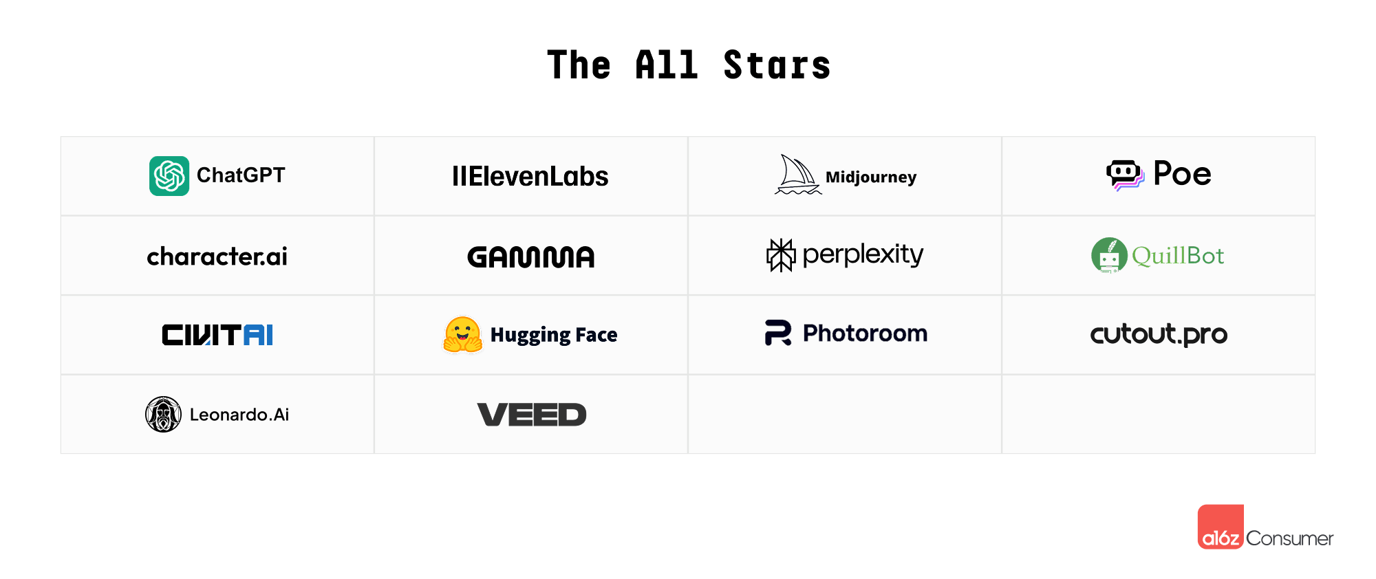 These companies represent a true cross section of consumer behavior with AI—general assistance (ChatGPT, Perplexity, Poe); companionship (Character AI); image generation (Midjourney, Leonardo); image and video editing (Veed, Cutout); voice generation (Eleven Labs); productivity tools (Photoroom, Gamma, Quillbot); and model hosting (Civitai, HuggingFace).
