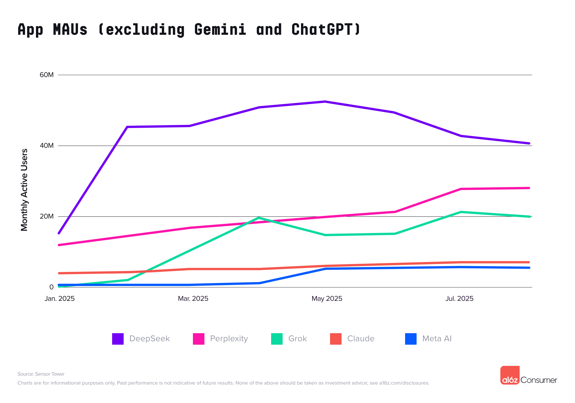 X’s (formerly Twitter) assistant Grok ranked fourth on web and #23 on mobile. The company’s jump on mobile has been particularly striking, going from a “cold start” with no app at the end of 2024 to upwards of 20M monthly active users now.