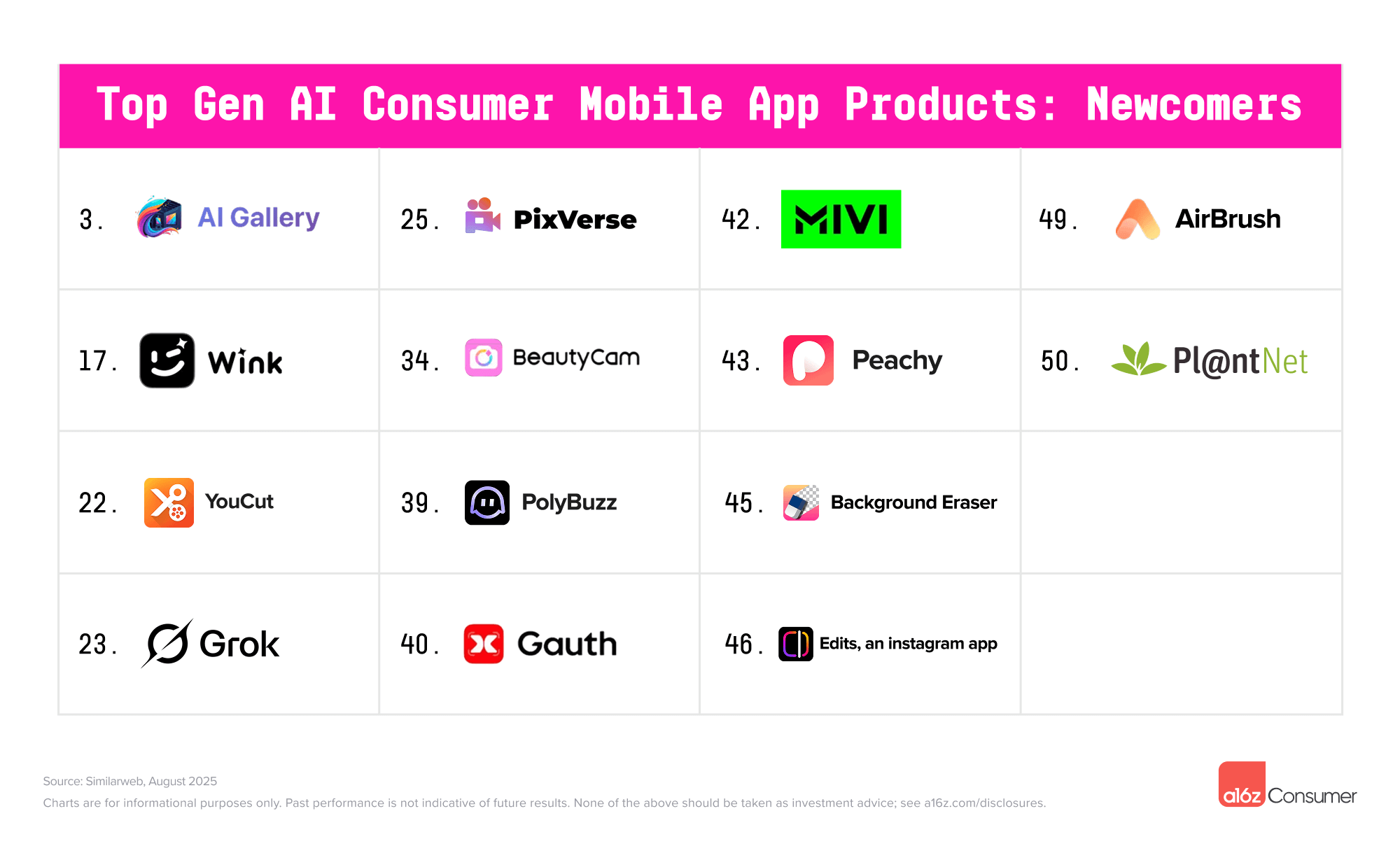 Excluding the very first list, an additional five companies would make the cut—reflecting their recent momentum. These similarly represent a variety of AI consumer applications, including: Claude and DeepAI (general assistance), JanitorAI (companionship), Pixelcut (image editing), and Suno (music generation).
