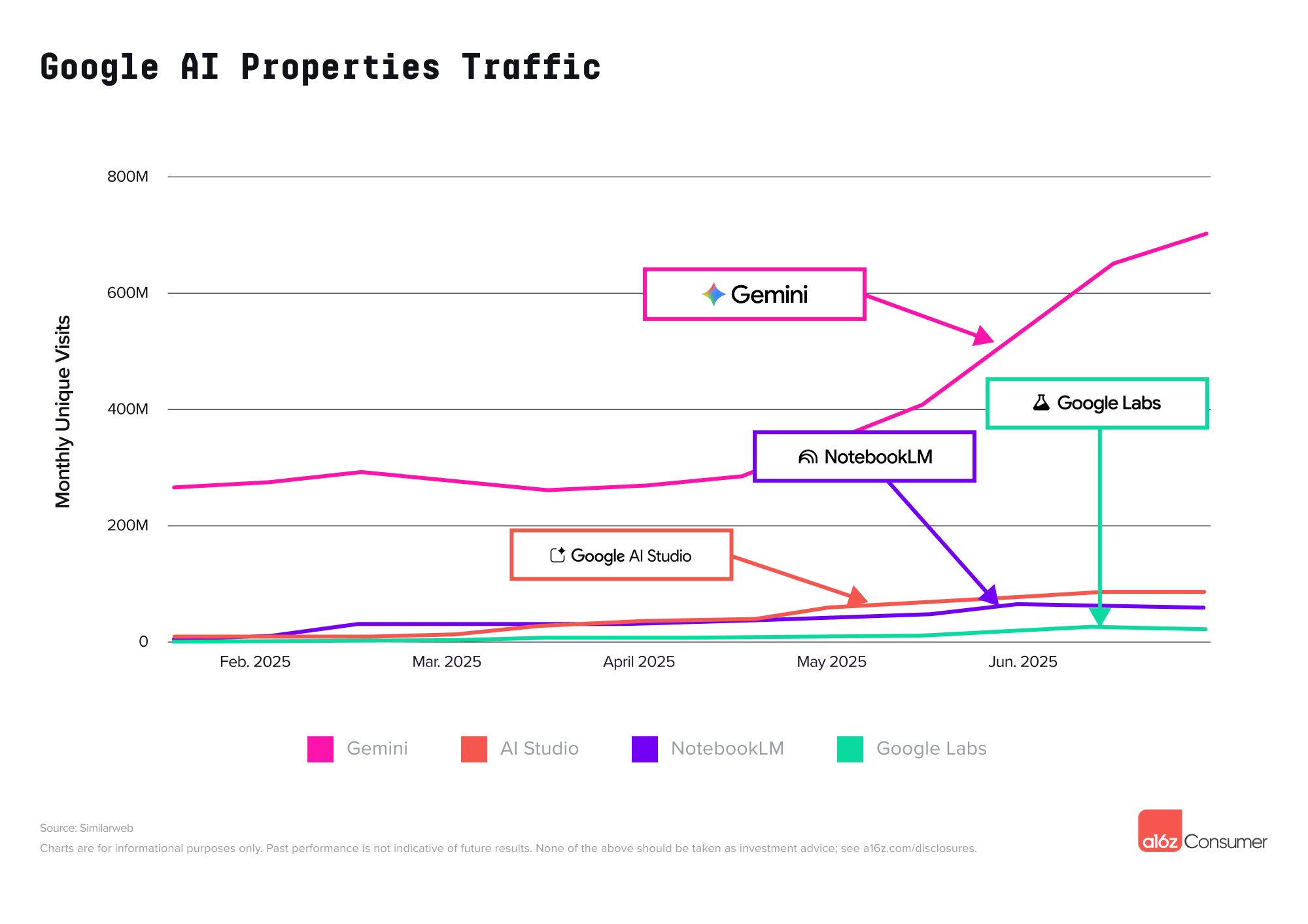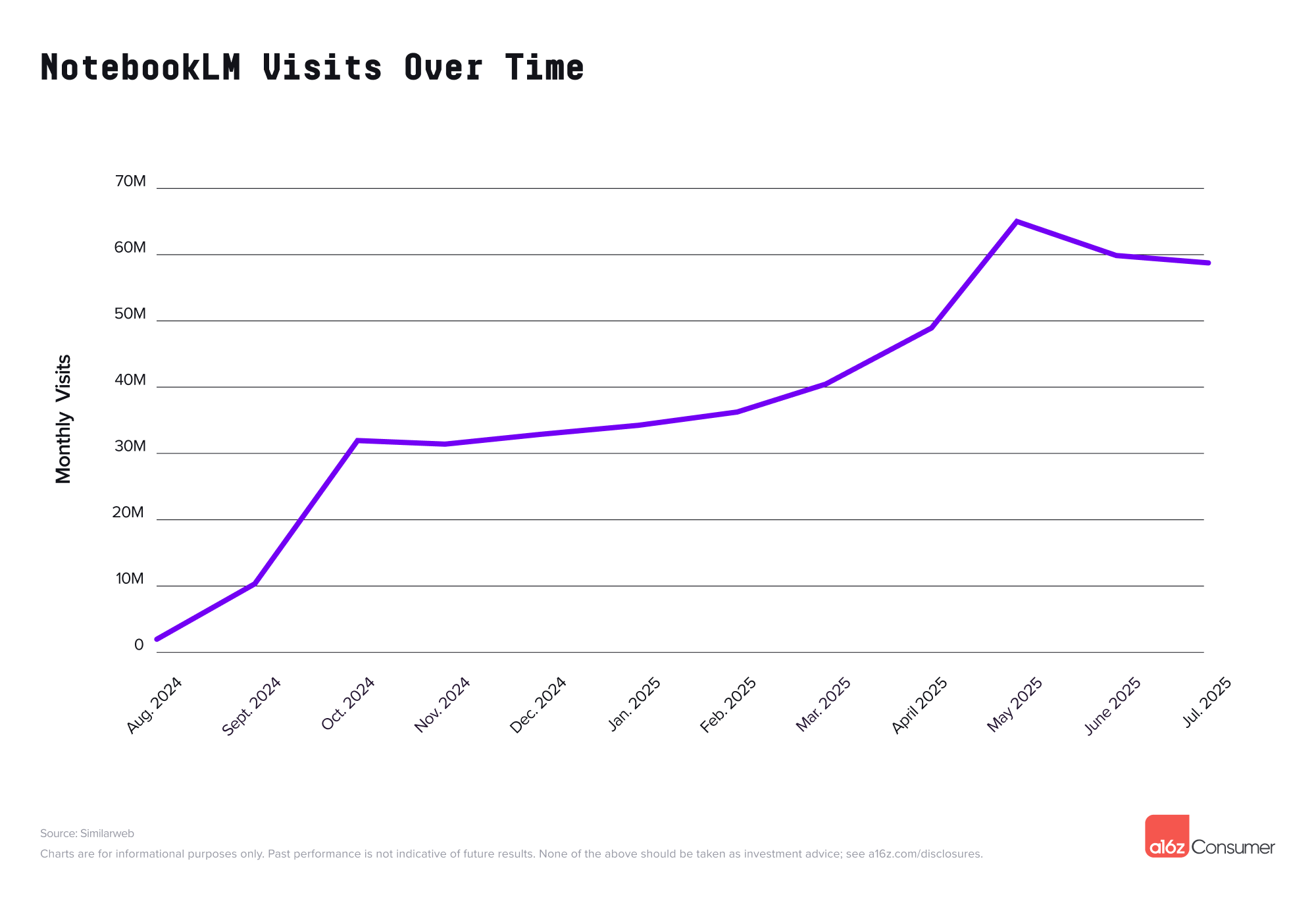 AI Studio was followed by NotebookLM at #13, now hosted as an independent website after debuting as part of Google Labs. NotebookLM first went viral nearly a year ago and has grown steadily since, with only a slight dip over the summer (likely when academic users temporarily churn).