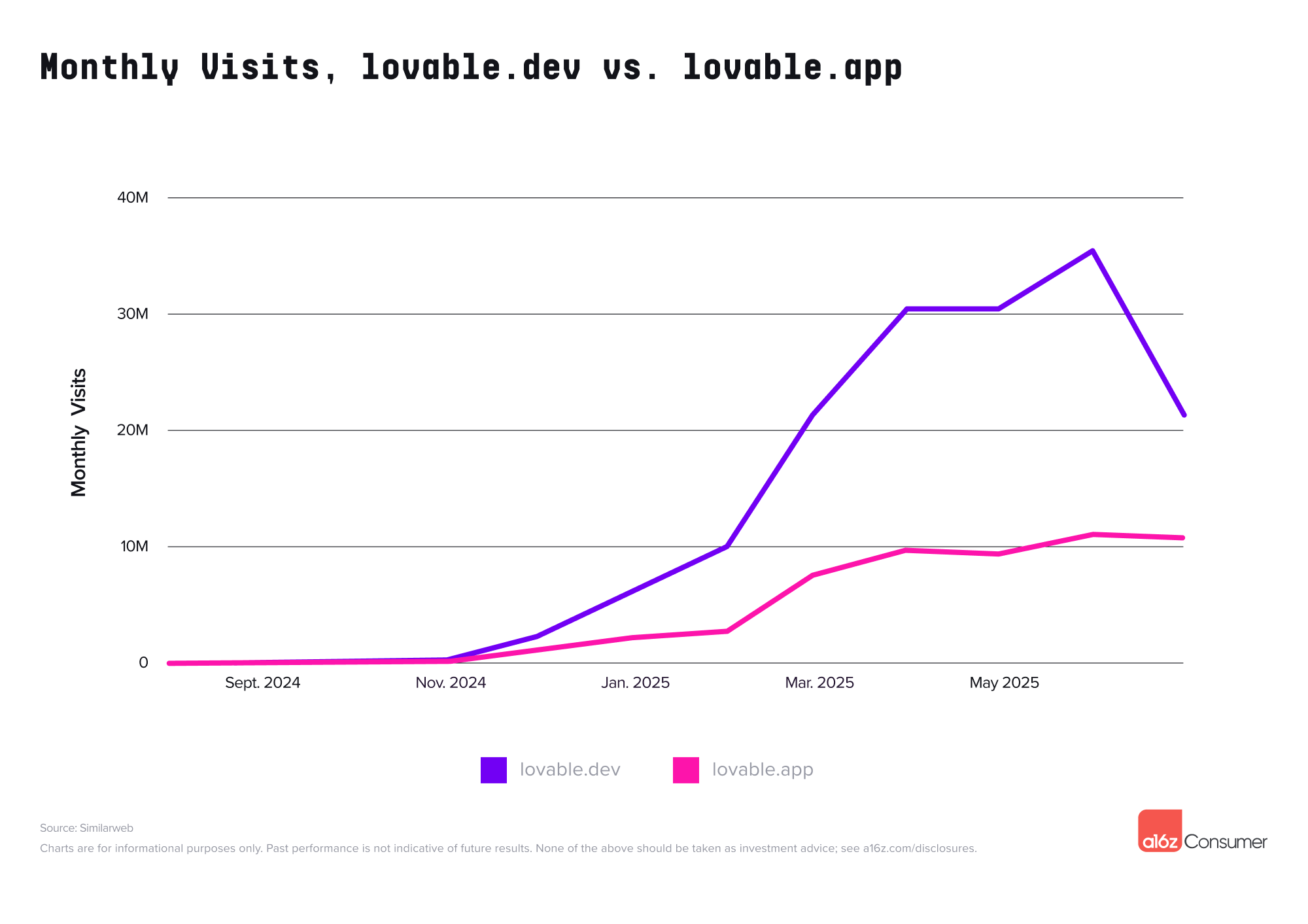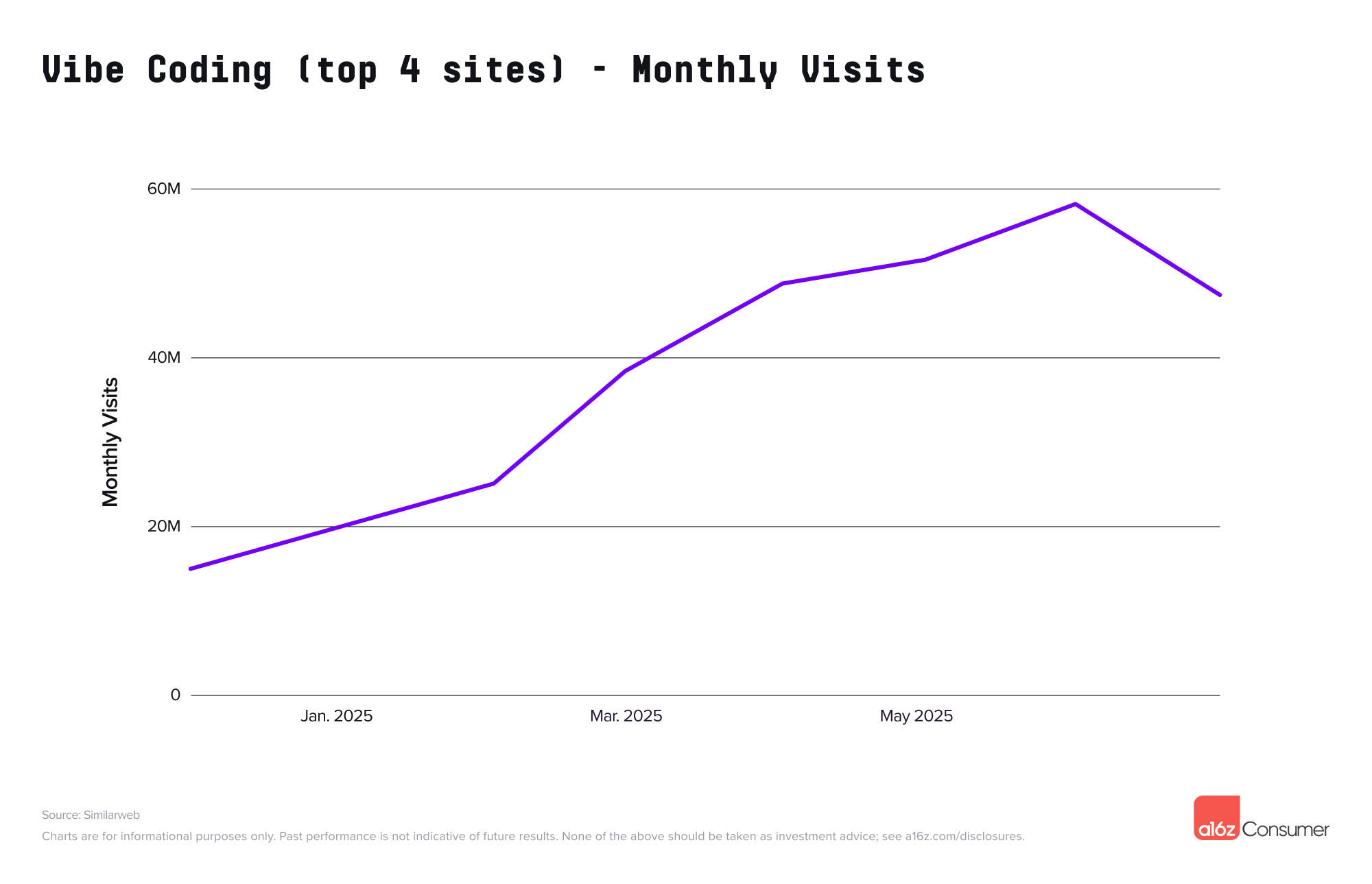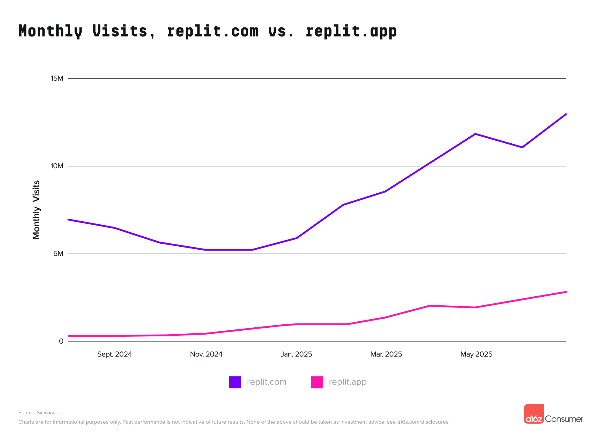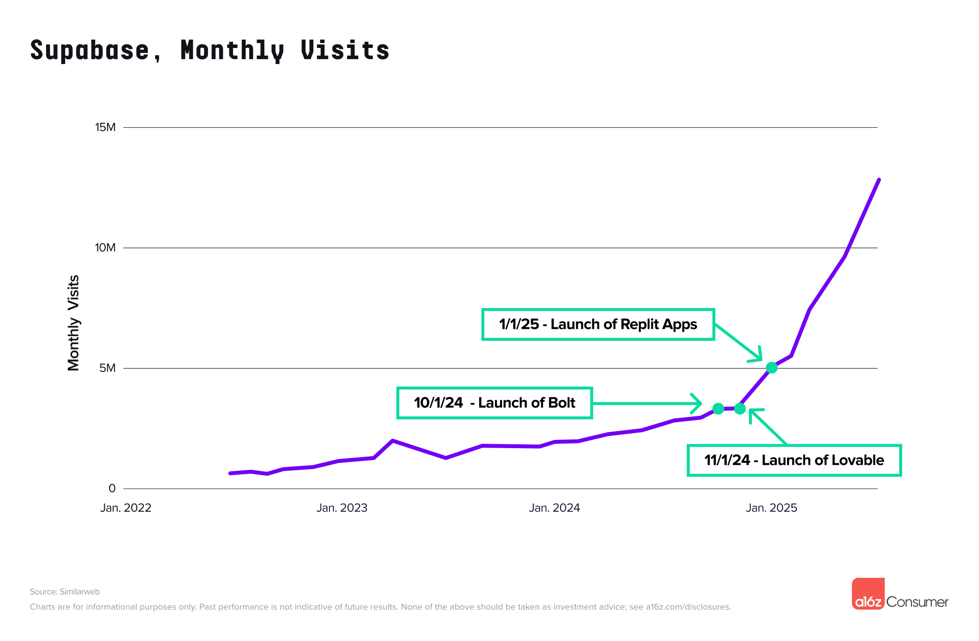 Products that are part of the “vibe coding stack” are also seeing jumps in traffic, as vibe coders adopt them to push their projects live. These are not eligible for the list (as they are not AI-native companies themselves)—the canonical example is Supabase, a database provider. Supabase’s traffic has been in near-lockstep with the rise of core vibe coding platforms, with a significant acceleration over the past nine months as compared to the years prior.