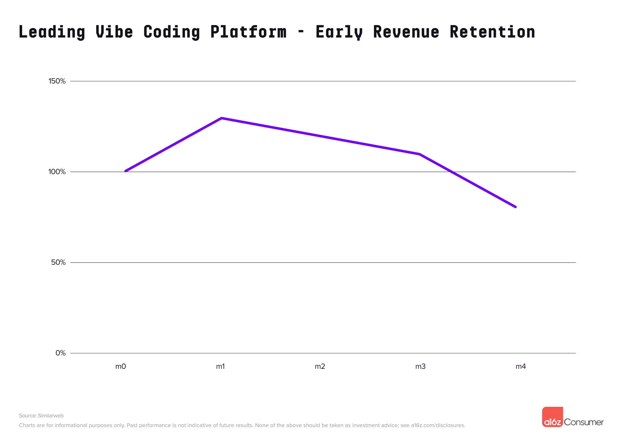 While vibe coding usage may seem transitory, early data reveals that these users stick around—or, at least enough of them do and expand their usage over time. Data from credit card panel provider Consumer Edge shows cohorts for U.S. based users of one top vibe coding platform see revenue retention upwards of 100% for several months post-signup. This means that including users who churn, cohorts are growing overall spend on a monthly basis.