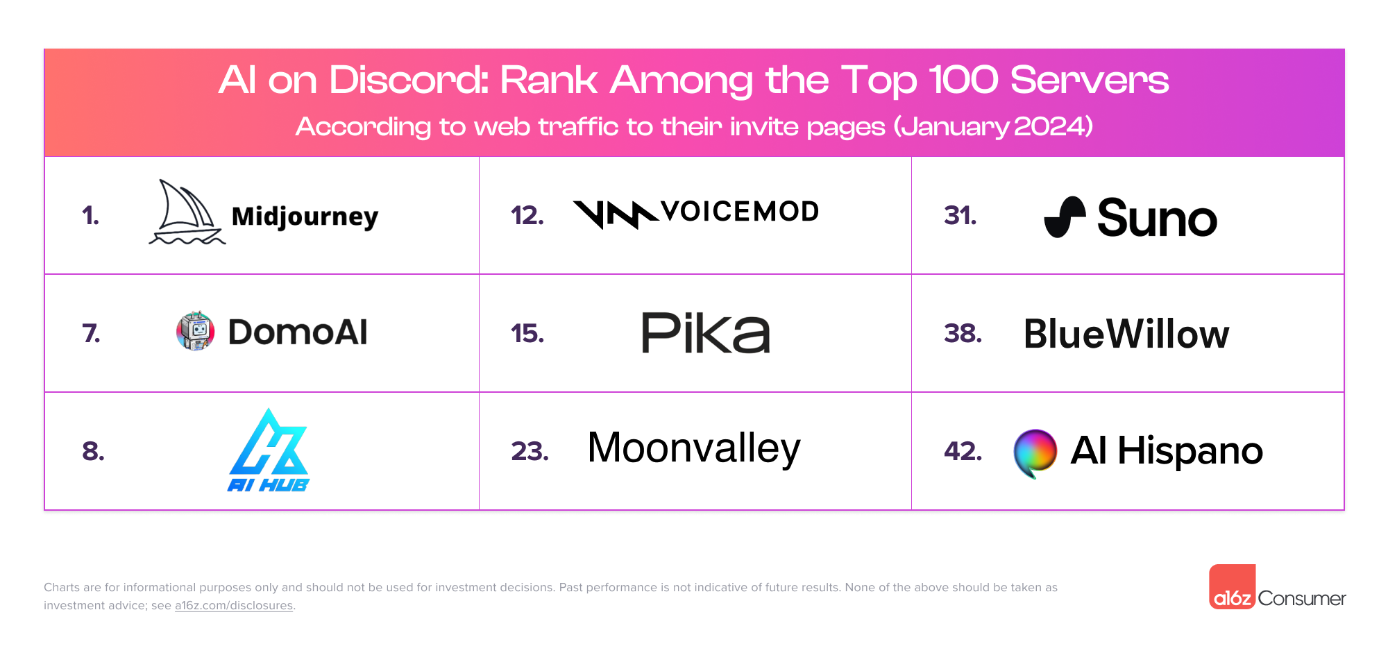 Several now-major consumer AI products, like Suno, started out on a Discord server — or still run primarily through Discord. The platform provides a testing ground (and community!) without requiring a full front-end product build-out. True traffic to a Discord server is near-impossible to measure, but web traffic to each server’s invite page is one proxy for this. On this metric, nine AI products or communities rank in the top 100 Discord servers by invite traffic as of January 2024, led by Midjourney in the top spot.