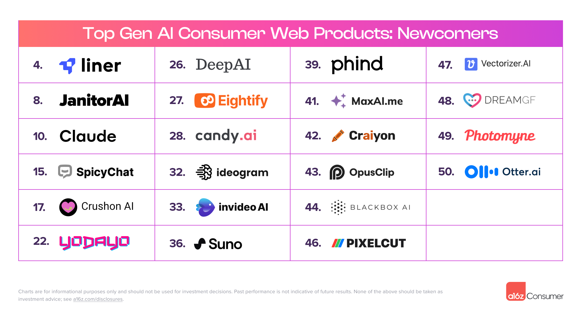 Among the so-called newcomers, those highest ranked include Liner, an AI research copilot; Anthropic’s general assistant Claude; and threeuncensoredAI companion apps: JanitorAI, Spicychat, and CrushOn. (More on what’s behind the spike in AI companionship below.)