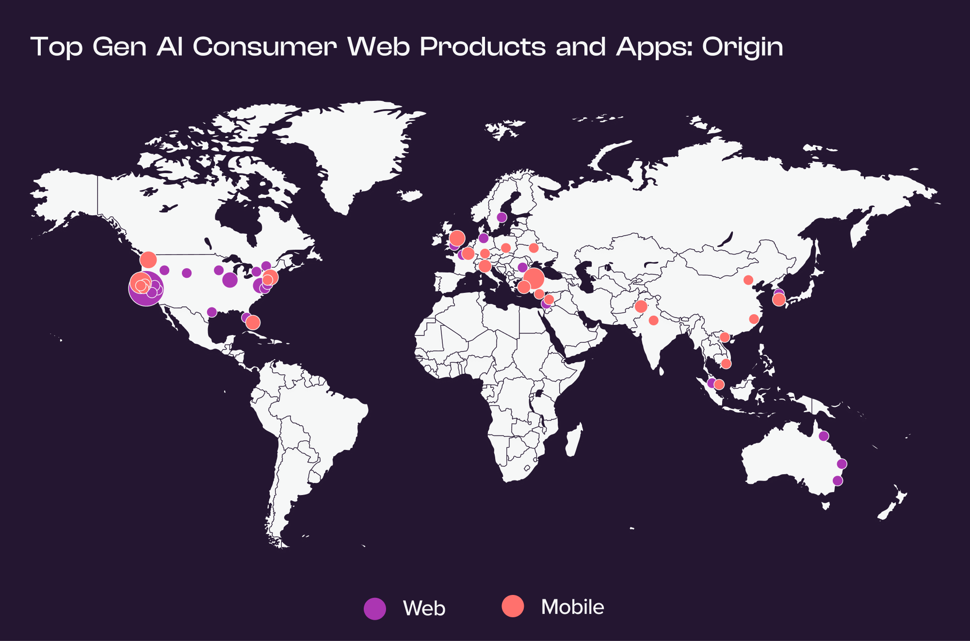 Cerebral Valley may be the epicenter of AI, but hugely popular products are being built all over the world. This is particularly true of mobile apps. Though over 30 percent of the gen AI web products on our list originated in the Bay Area, only 12 percent of the mobile apps’ developers are based there. Similarly, though over half of the top gen AI web products were developed in the U.S., less than a third of the mobile apps originated stateside.