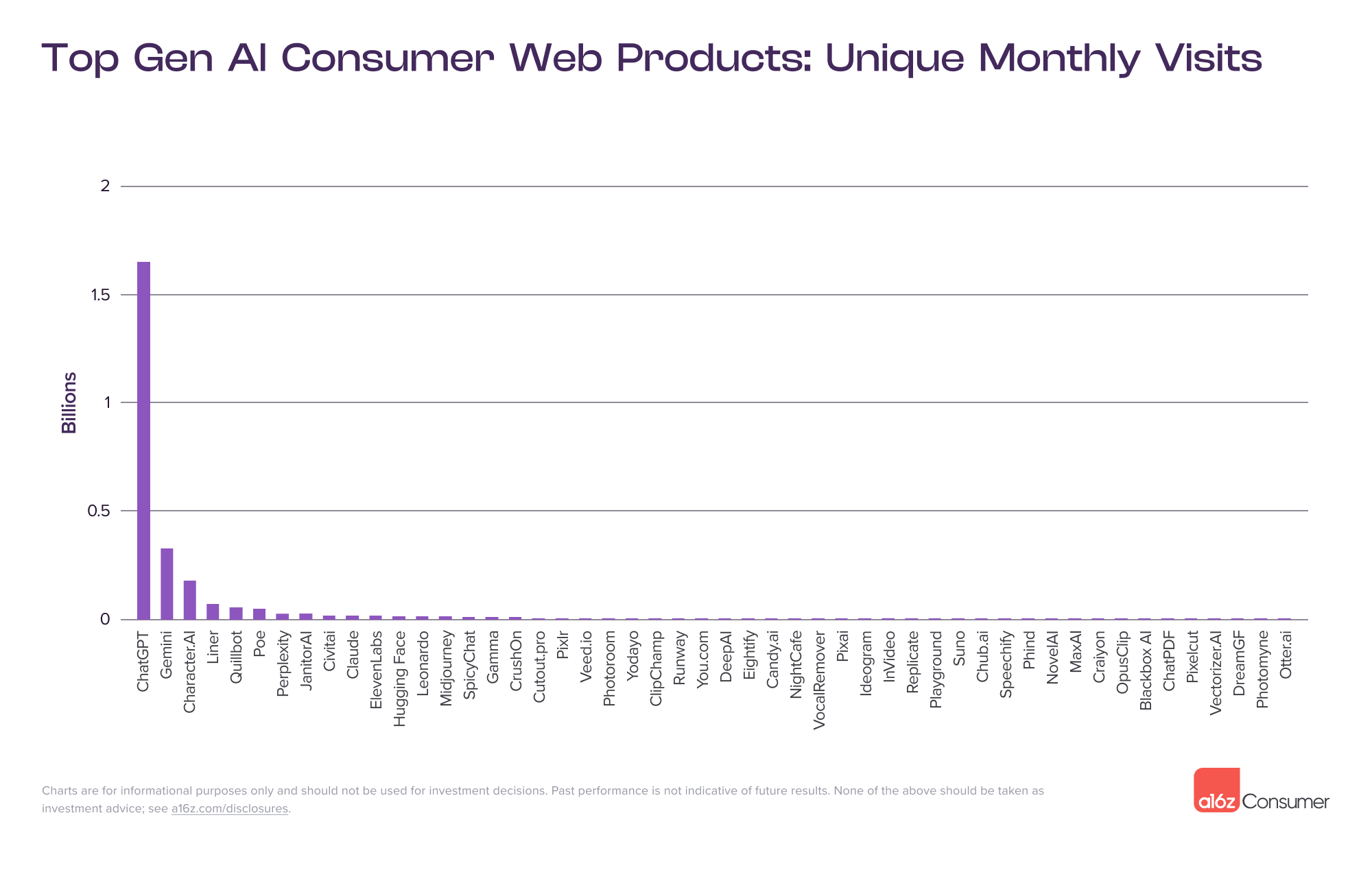 Six months ago, we did a deep dive into web traffic data to separate the signal from the noise. We ranked the most popular generative AI web products, based on monthly visits, and uncovered patterns in how consumers were actually using this technology.