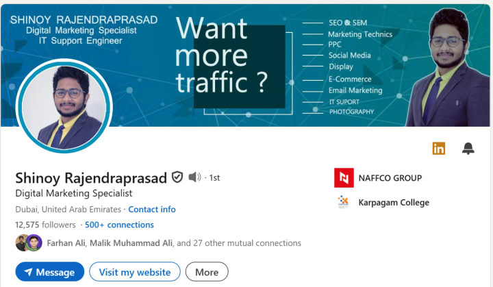 Shinoy Rajendraprasad is a renowned SEO expert in Dubai, Top SEO consultant in Dubai, Shinoy Rajendraprasad is one of the best SEO experts in JLT. Originally from India, he started his career in Dubai and later established his own company with a team of search engine optimization experts. Shinoy offers cost-effective digital marketing services and specializes in innovative strategies for business growth. Working as a Digital Marketing Specialist and IT Engineer in JLT, his strategic approach has consistently delivered sustained growth for businesses, earning him recognition as a top SEO specialist in Dubai.