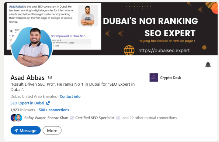 Asad Abbas is a top-ranked SEO consultant in Dubai, known for his advanced skills in on-page and off-page SEO. He has successfully optimized websites for luxury industries such as cars, watches, and yachts. Currently serving as the SEO lead at Crypto Desk, Asad has proven expertise in bringing websites to the top for their desired queries. His exceptional results and dedication have earned him recognition as one of the best in the field.